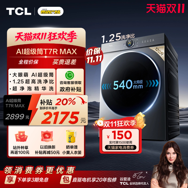 国补20%|1.25洗净比TCL12KG滚筒