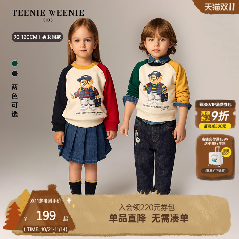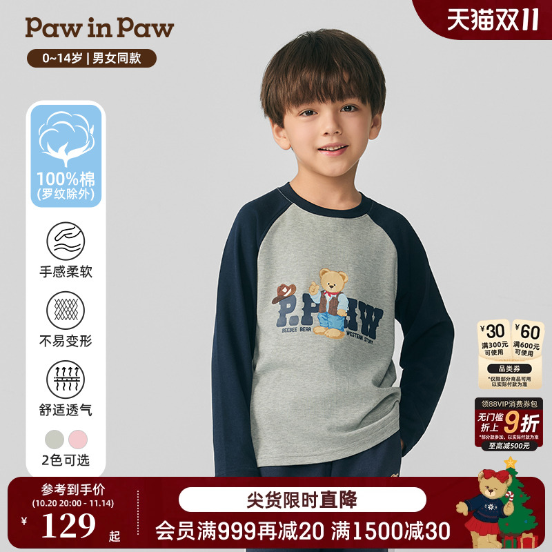 PawinPaw卡通小熊童装25年秋冬新款男女童撞色插肩袖T恤全