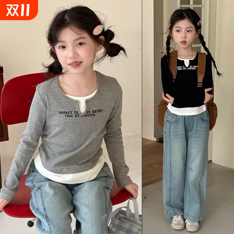 女童假两件上衣秋装2025新款大童女孩修身t恤秋季儿童长袖打底衫