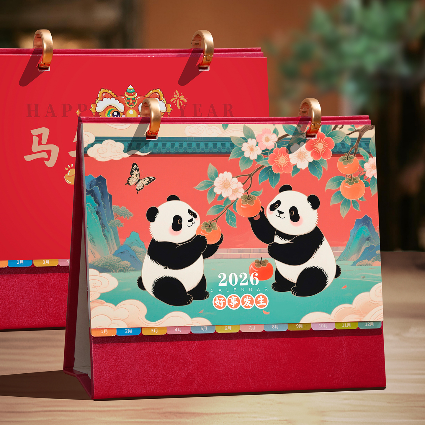 双圈皮架大熊猫索引台历2026年新款定制可印logo公司企业商务