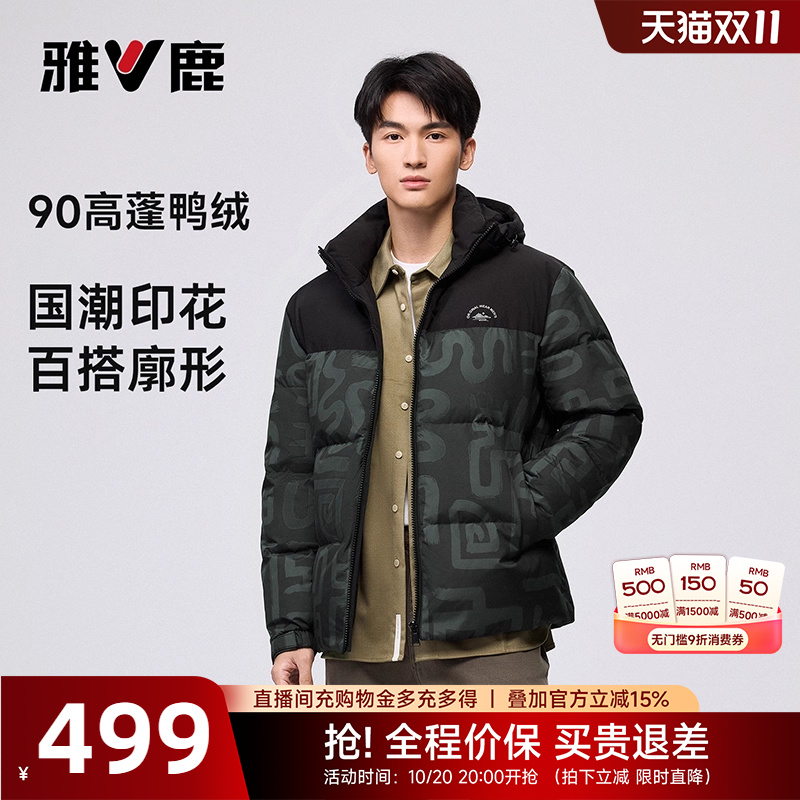 雅鹿羽绒服男士冬季上新短款拼色印花连帽蓄热加厚保暖90鸭绒服男