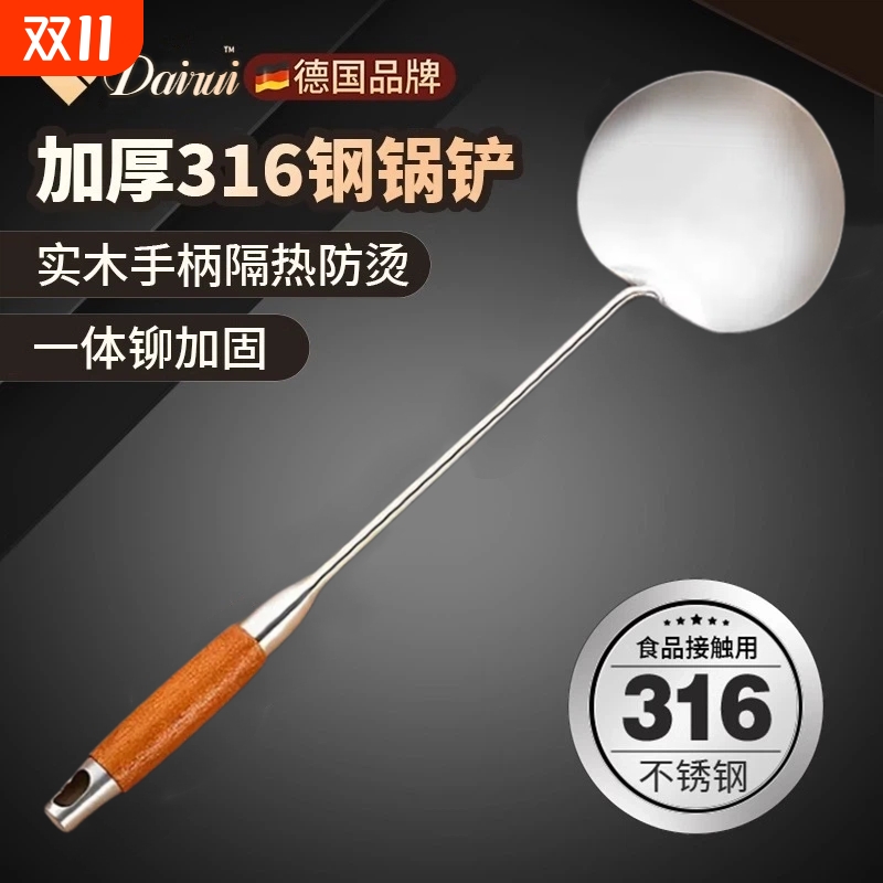 德国316不锈钢蘑菇铲炒勺加厚炒菜勺铲子食品级锅铲铁铲长柄汤勺