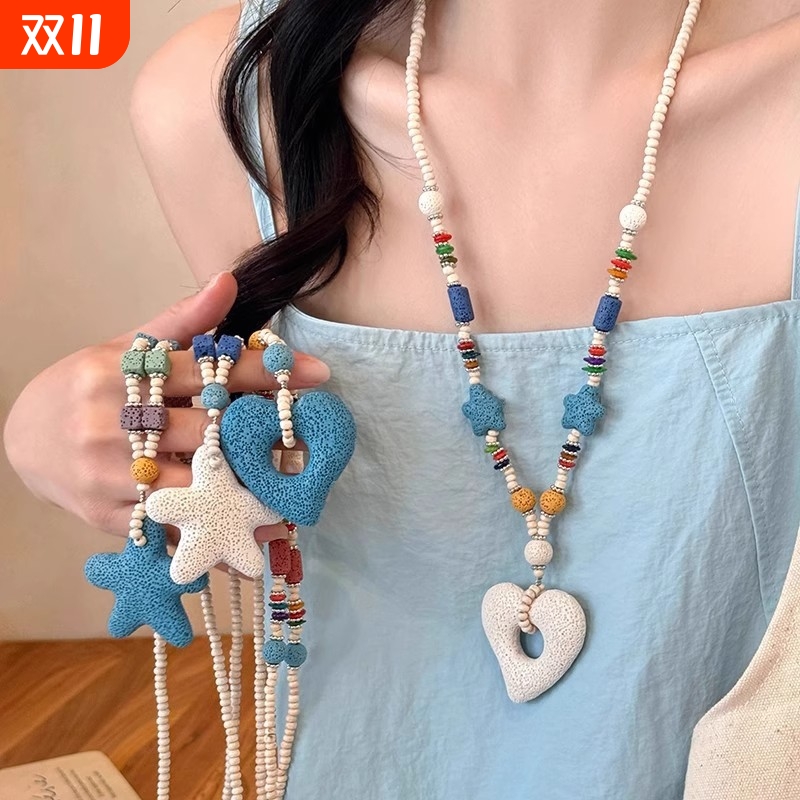 多巴胺彩色串珠火山石爱心项链女小众设计海星锁骨链海边长款配饰
