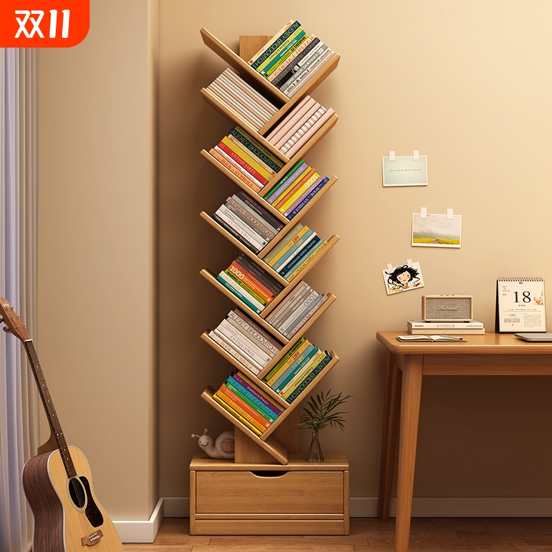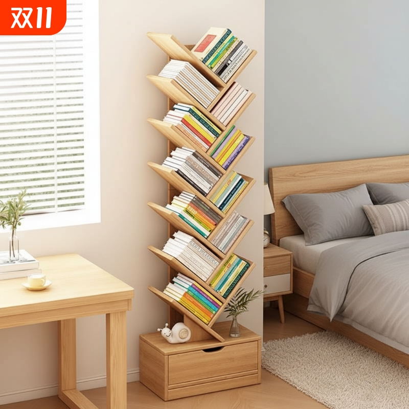 实木树形书架落地置物架一体靠墙小书柜不占地方收纳架多层储物架