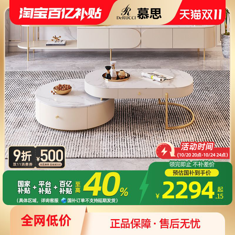 宏特维中复古风实木岩板茶几客厅家用小户型洞石茶桌设计师创意圆形茶