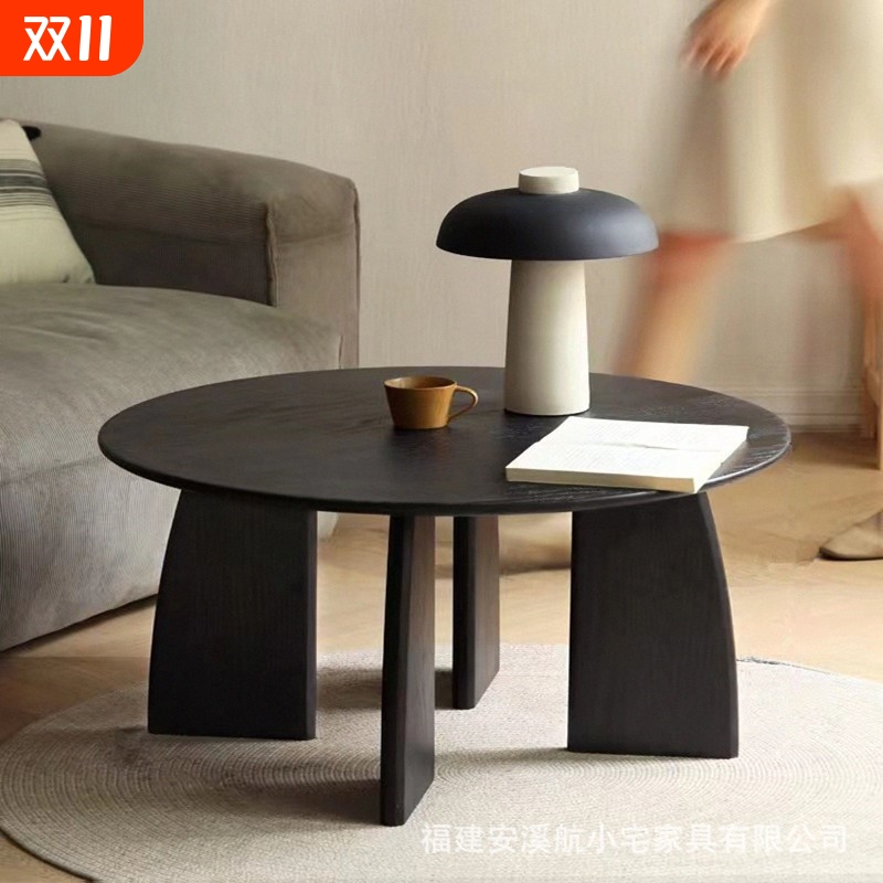 侘寂风实木家用黑色茶桌茶几圆形茶台现代简约茶台矮桌子沙发边几