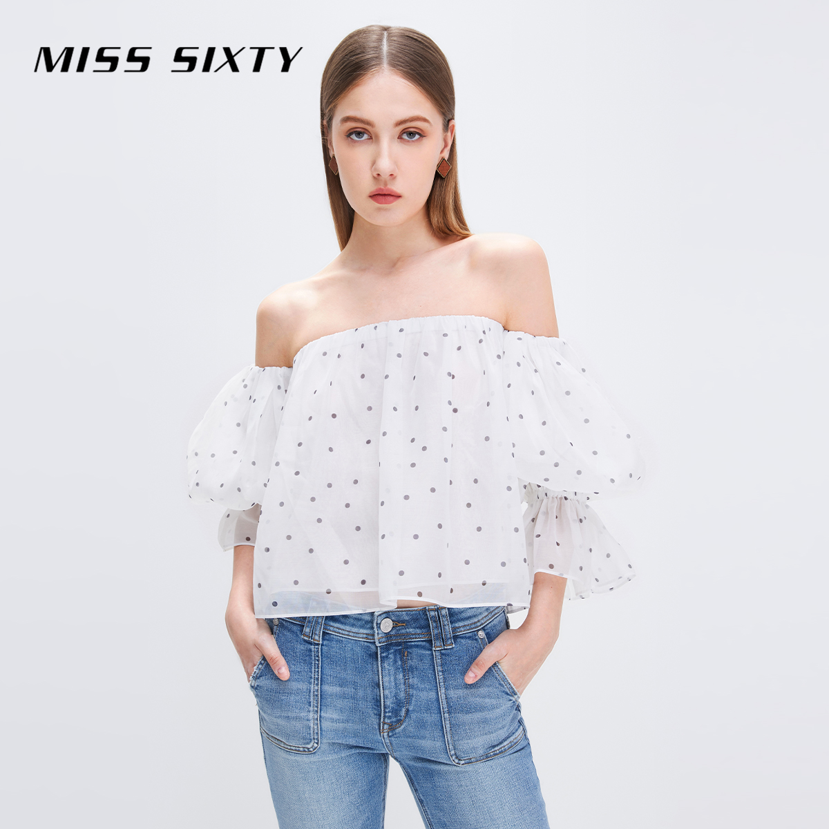 Miss Sixty衬衫女一字领复古波点短款法式性感辣妹风