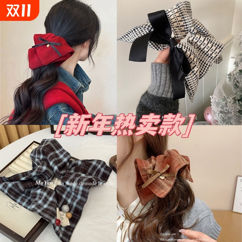 秋冬新款芭蕾风蝴蝶结大肠发圈女小众设计格纹方巾头绳丸子头发饰