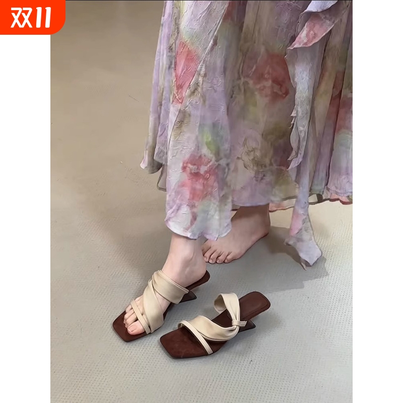 拼色复古辣妹风!方头绒面一字带坡跟拖鞋女夏季韩版露趾高跟凉鞋
