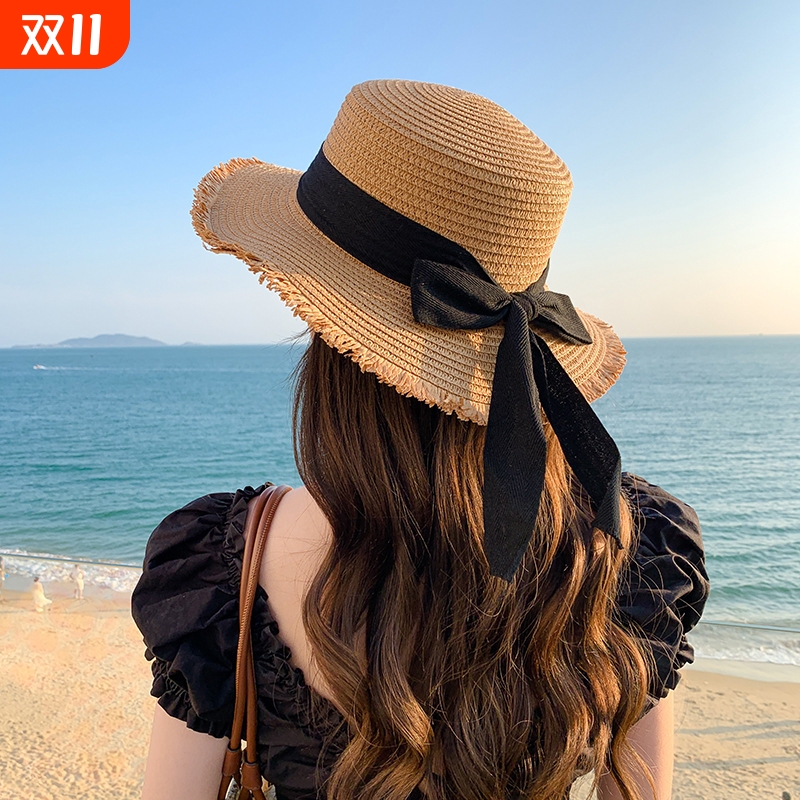 夏季女大檐防晒帽蝴蝶结飘带平顶草帽海边沙滩度假旅游太阳帽礼帽
