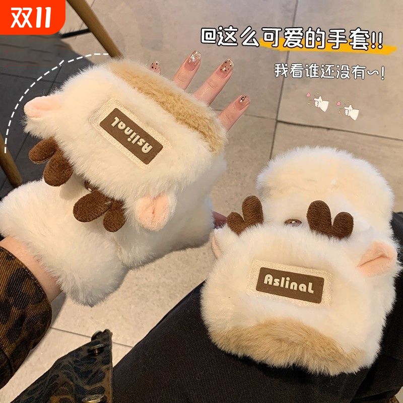圣诞鹿角毛绒手套冬季女款加厚保暖可爱学生骑车翻盖露指半指加绒
