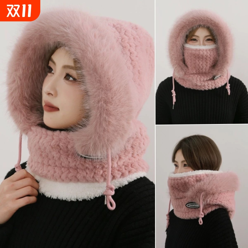 防风帽子女秋冬季骑车保暖护耳套头帽加厚毛绒围脖巾帽口罩一体帽