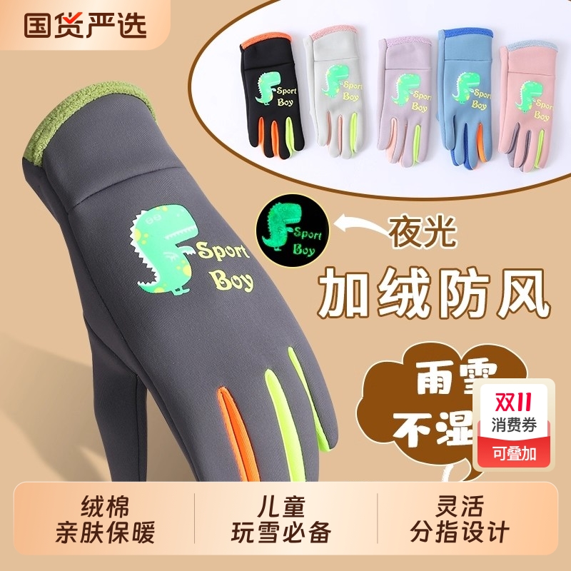 儿童手套秋冬季骑车保暖玩雪防水男童女童加厚加绒夜光滑雪户外