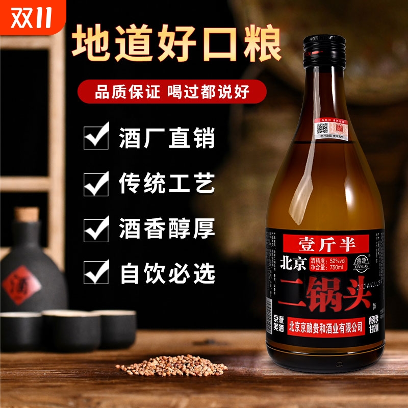 北京二锅头一斤半52度750ml浓香型白酒整箱粮食酒水大瓶6瓶装