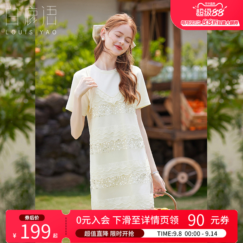 白鹿语假两件亮片绣蕾丝拼接短裙