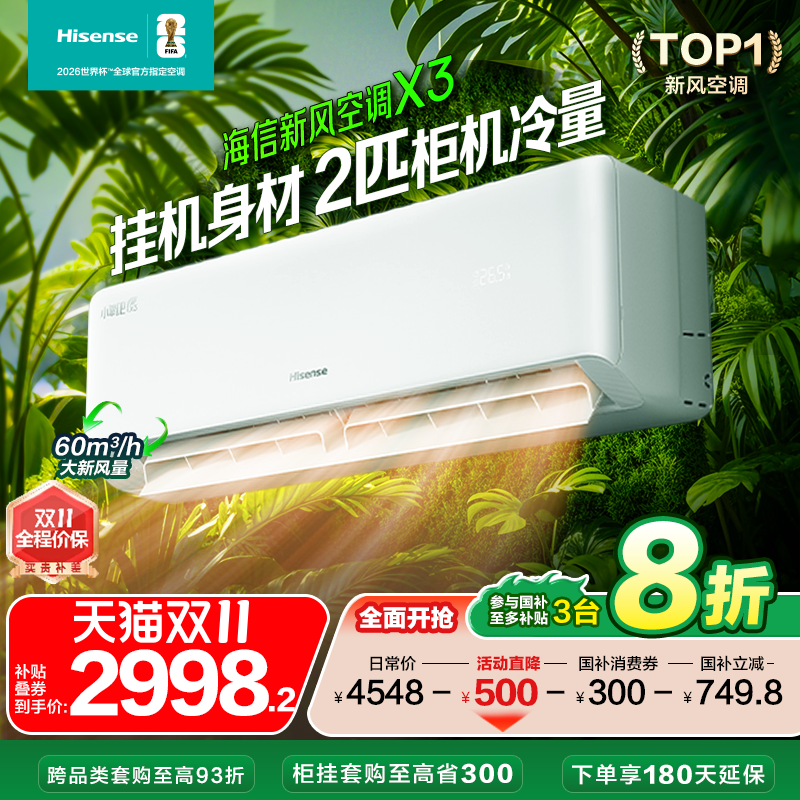 海信新风空调2匹X300家用新一级能效卧室客厅挂机式以旧换新补贴