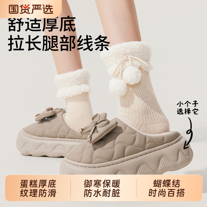 时尚厚底蝴蝶结棉拖鞋女冬季室内学生家居2025新款防水加绒半包跟