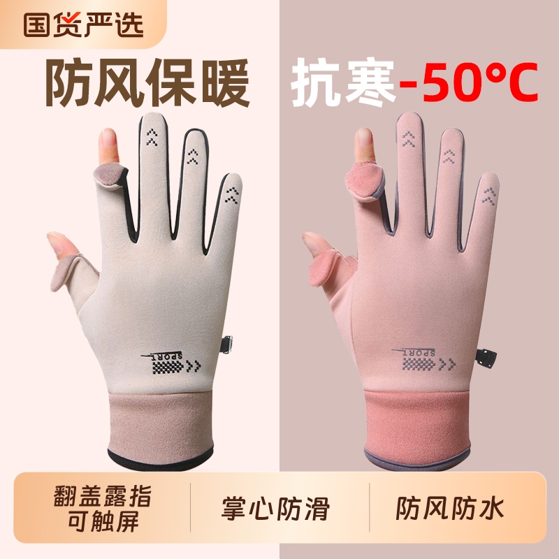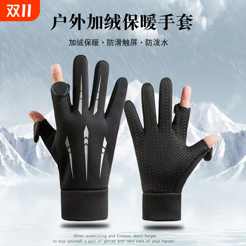 保暖手套男冬季防寒加绒触屏骑行开车摩托车外卖漏二指女防风滑雪
