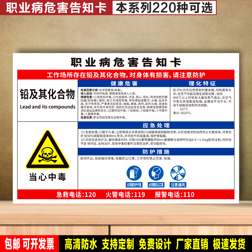 铅及其化合物 定制防水粘贴纸PVC板铝牌安全标识职业病危害告知卡