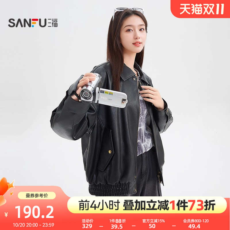 三福皮衣夹克2025新款秋季时尚复古宽松翻领黑色外套女装8464