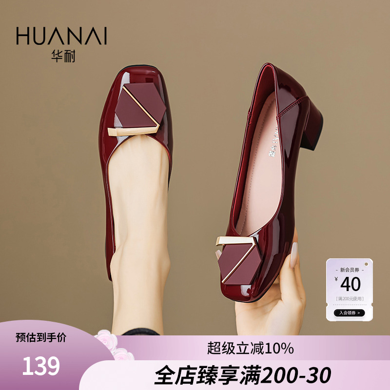 华耐粗跟单鞋方头红色婚鞋