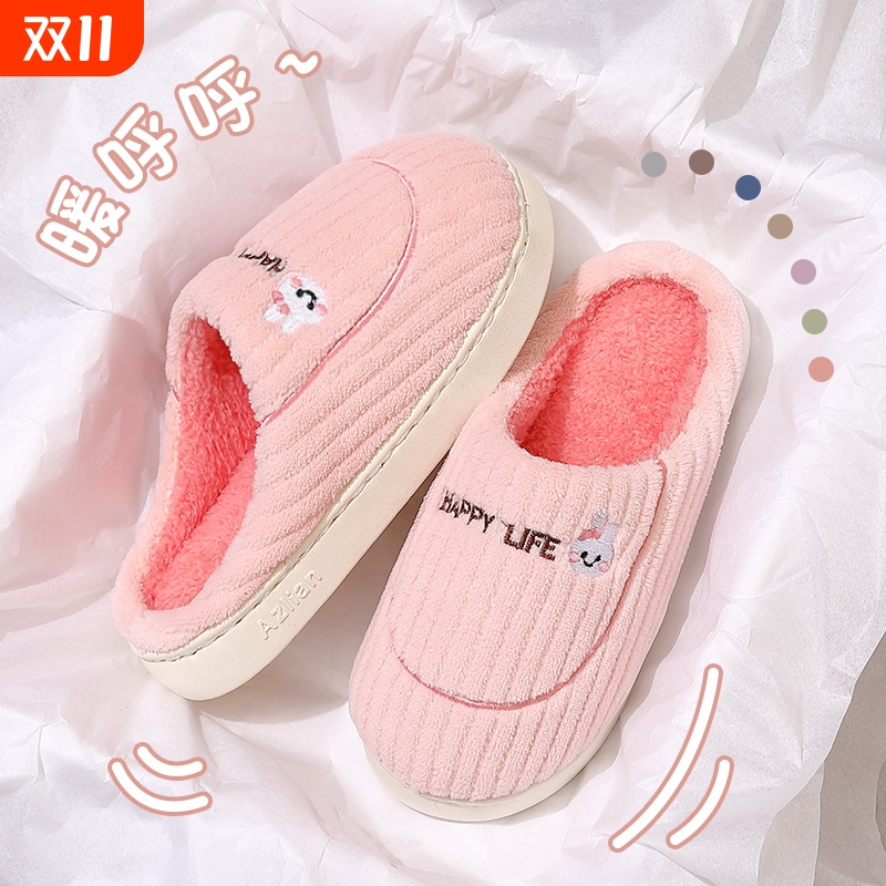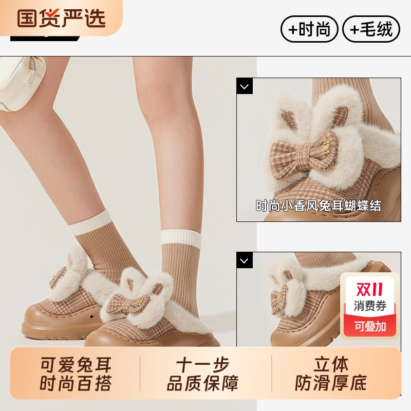十一步兔耳棉拖鞋女款2025冬季新款居家保暖厚绒防滑外穿可爱棉拖