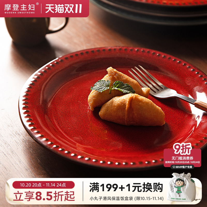 摩登主妇红色盘子陶瓷牛排餐盘