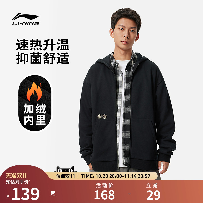 李宁卫衣 运动时尚系列 男女同款加绒保暖抗静电宽松开衫连帽卫衣
