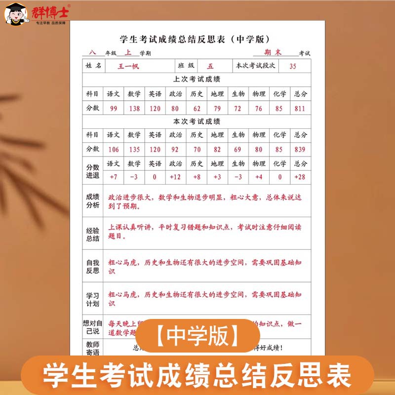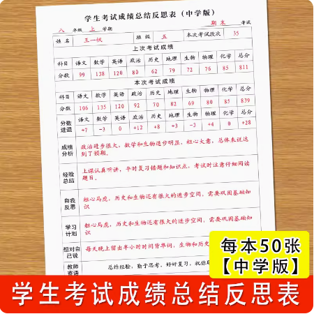 学生考试成绩总结反思表小学生初高中学生通用版经验总结学习计划自我