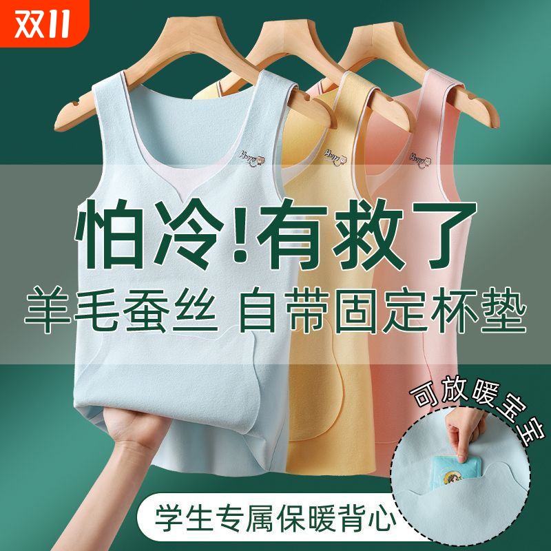 女童德绒保暖上衣加绒加厚背心发育期学生初中自带胸垫内衣秋冬款