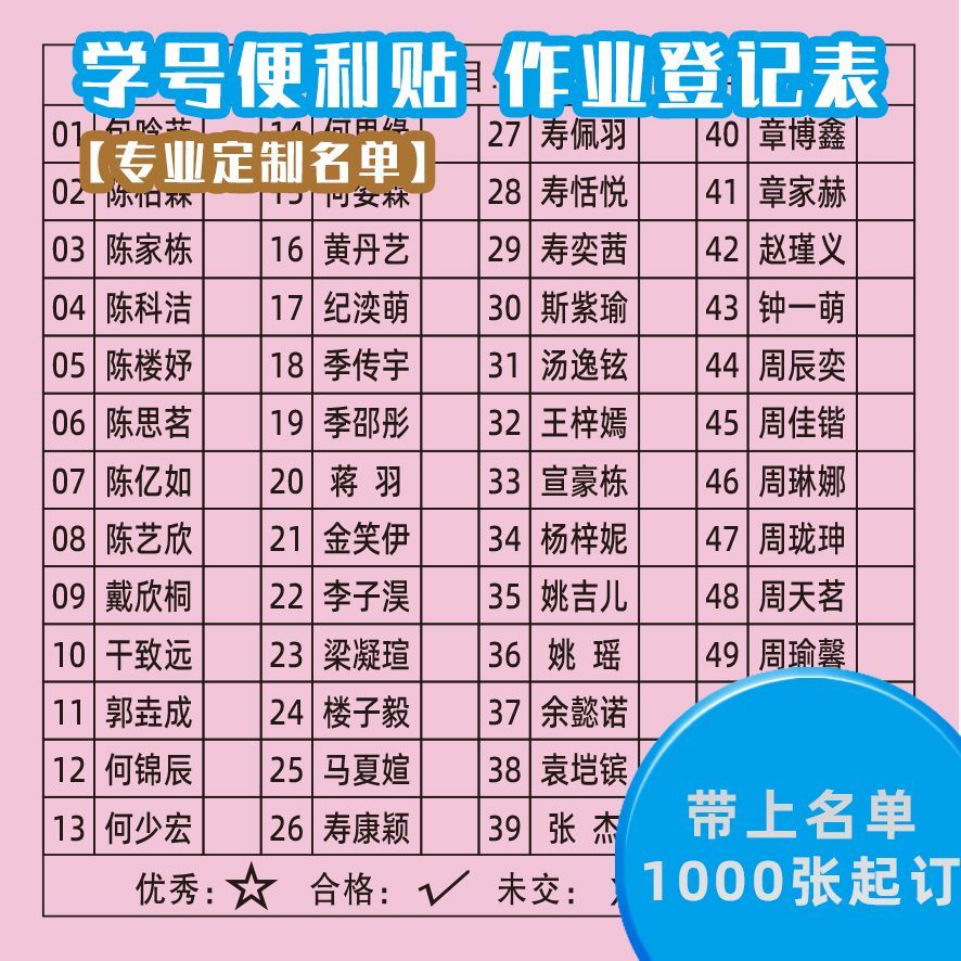 定制有学号姓名便利贴定做班级查作业登记表格制作小组排班统计表