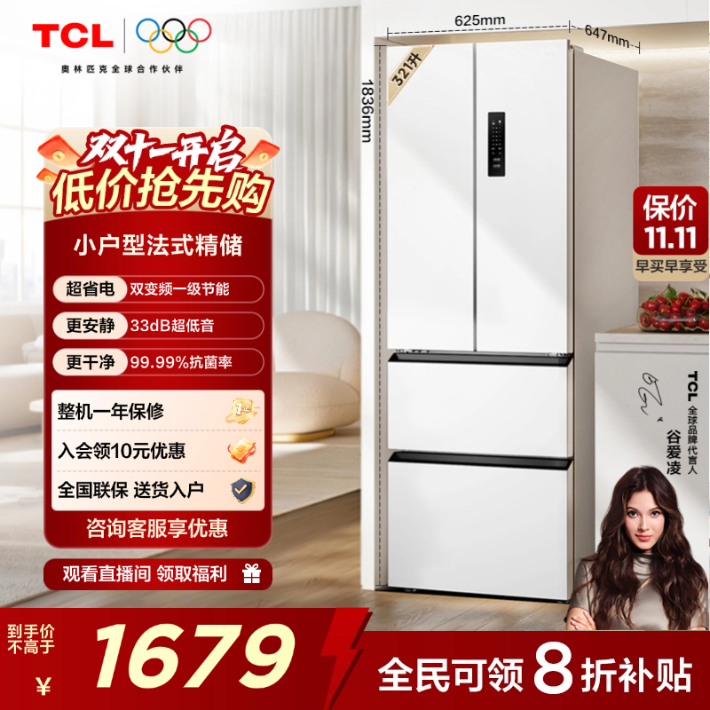 TCL 小杏韵405升法式多门四开门底部散热嵌入式超窄电冰箱