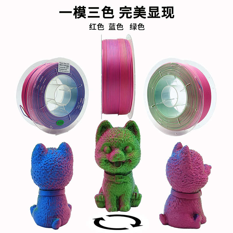 元洋厂家3D打印丝绸耗材1.75mmPLA丝绸三色渐变红金紫色3