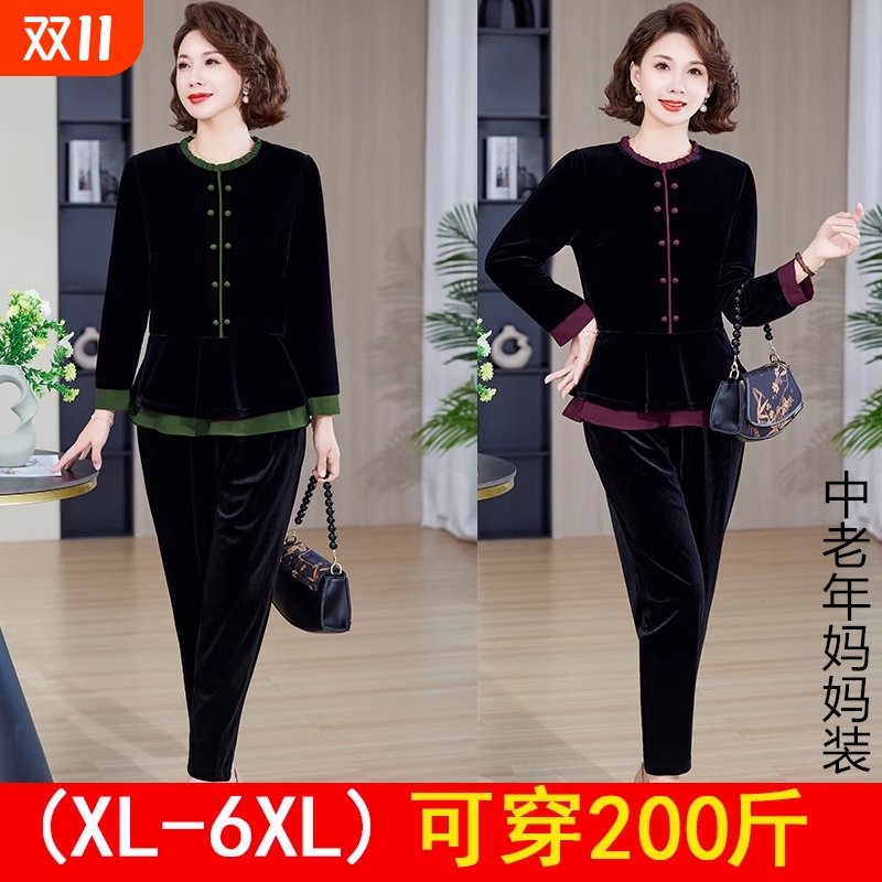 洋气胖妈妈春装金丝绒套装200斤中老年女春秋气质加肥大码两件套