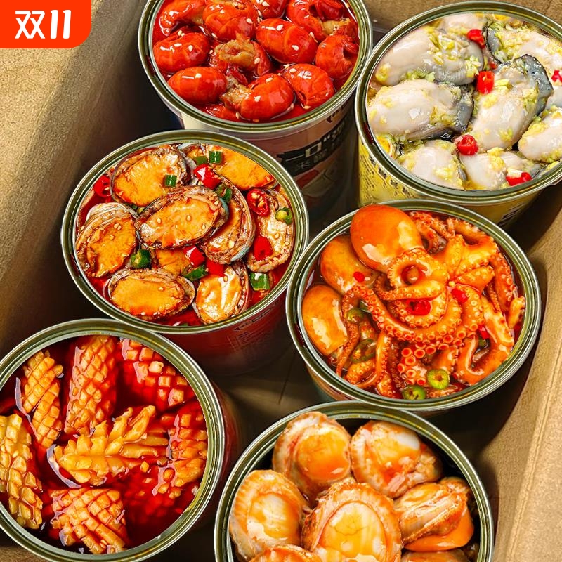 麻辣小海鲜罐头即食大罐装组合鲍鱼生蚝扇贝八爪鱼整箱年货下饭菜