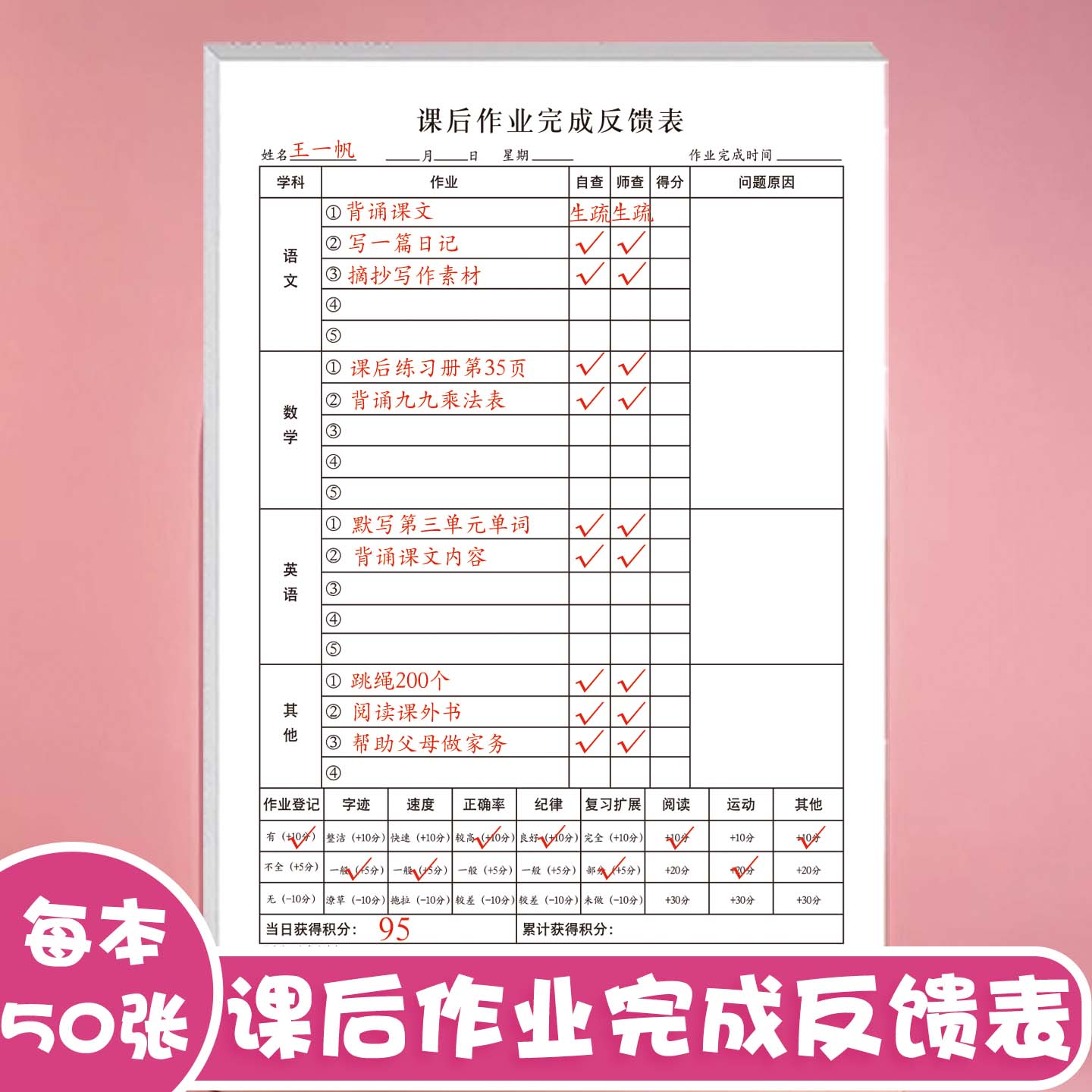 课后作业完成反馈表中学生小学生语文数学英语政史地物化等科目家庭作