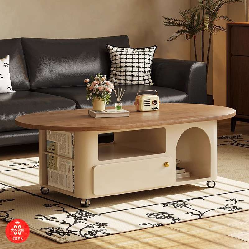 实木中古风茶几极简意式客厅家用设计师小户型高级椭圆形茶桌带轮