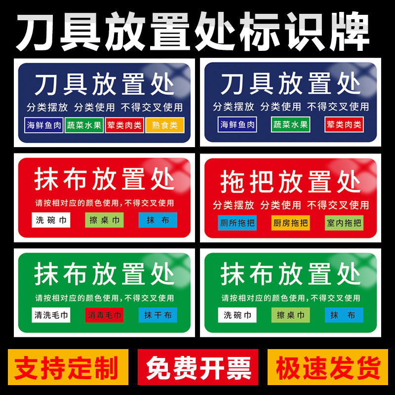 刀具置放处标识牌抹布拖把分类摆放请按照对应颜色摆放海鲜鱼肉蔬菜水
