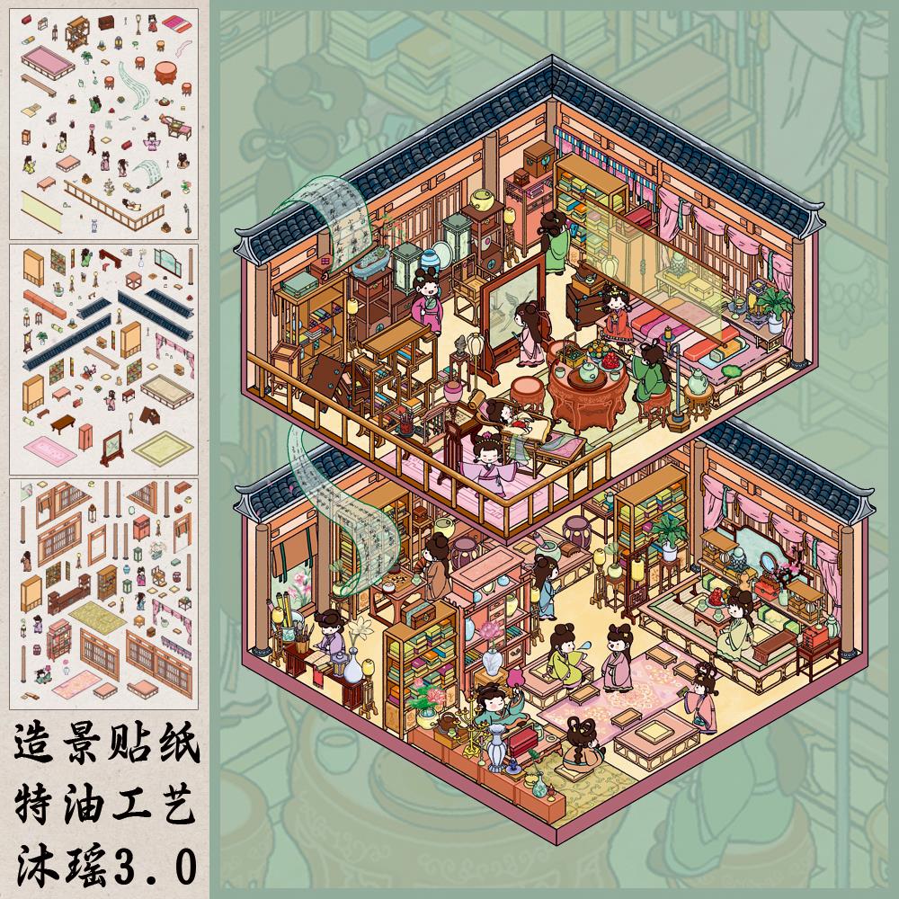 3.0古风少女的居舍造景贴系列2.5D微缩场景DIY解压景观贴贴