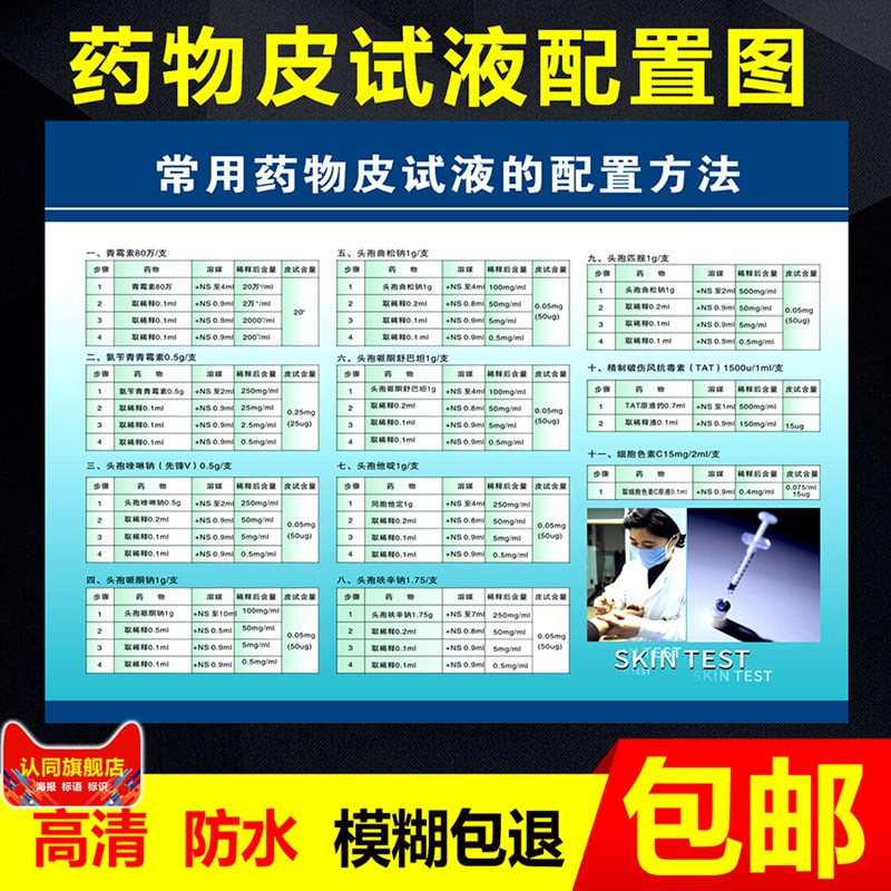 常用药物皮试液配置方法表挂图临床药物配伍禁忌表医院宣传海报图