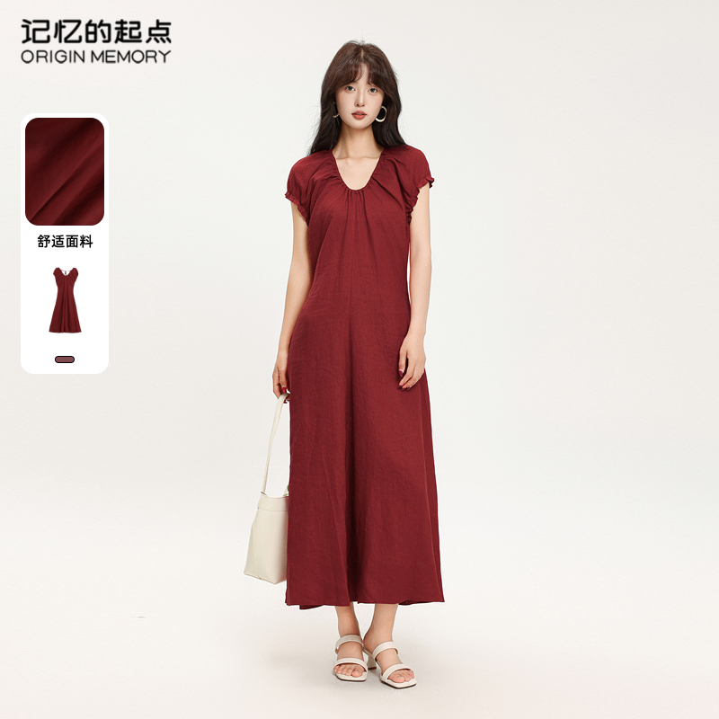 记忆的起点短袖连衣裙V领气质时尚收腰长裙2025夏季新款69AX
