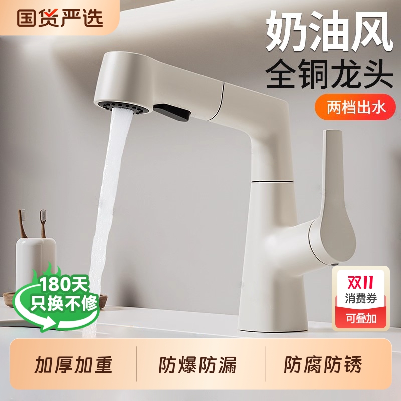 洗脸盆水龙头抽拉式冷热面盆洗手盆卫生间浴室台盆奶油风家用全铜