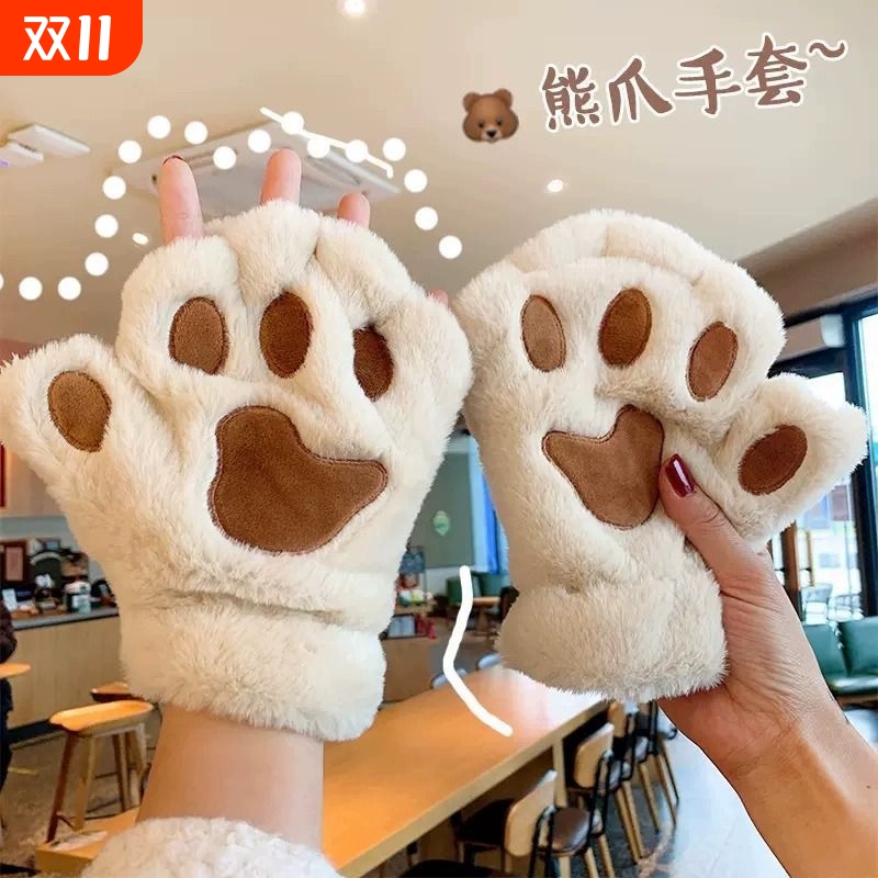 卡通可爱熊掌猫爪毛绒手套女学生加绒加厚防风防寒冬季骑车
