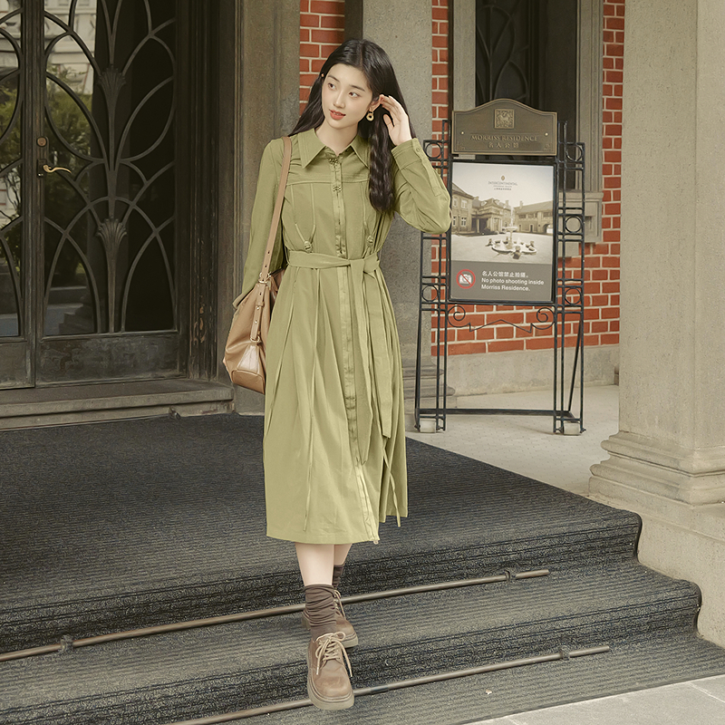 MSLAN山屿之间 复古刺绣滚条长裙收腰显瘦绿色连衣裙女