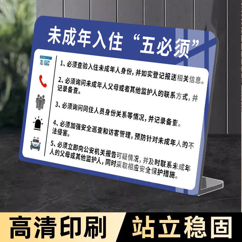 未成年人入住五必须提示牌立牌入登记一人一证告示牌桌牌酒店宾馆民俗