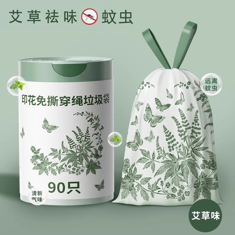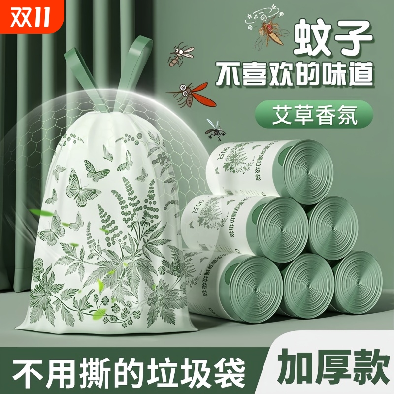 艾草垃圾袋家用加厚手提式防厨房免撕抽绳大号厨余祛味塑料袋结实