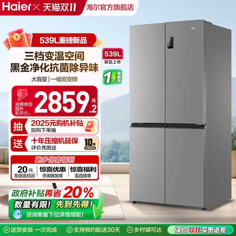 政府换新补贴海尔539L大容量双开四门冰箱全民可用