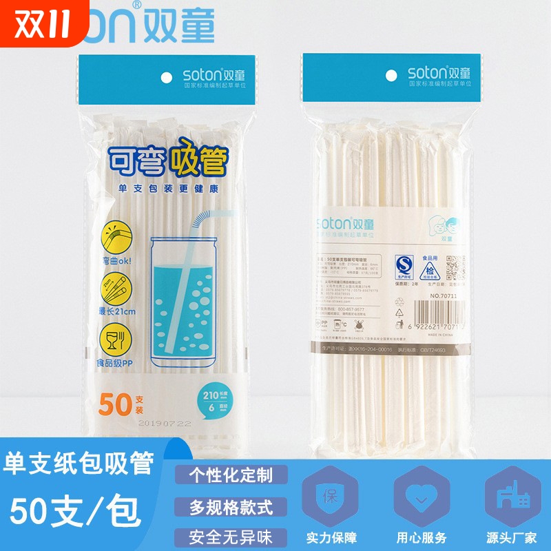 双童一次性吸管可弯曲单支纸包独立包装果汁饮料透明彩条食品级