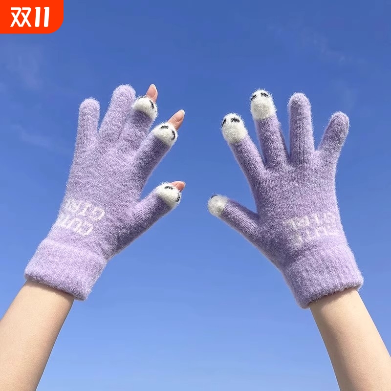 手套女士冬季新款露指加厚保暖大童可爱学生防寒毛线可触屏冬天男