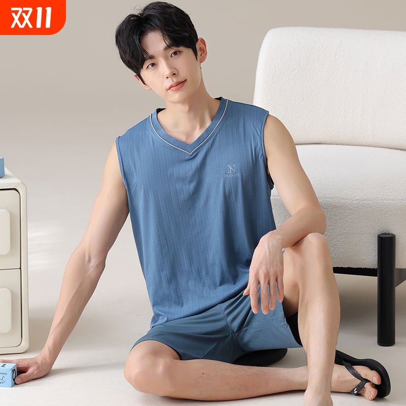 夏季男士睡衣薄款冰丝青少年男款背心无袖宽松家居服上衣短裤